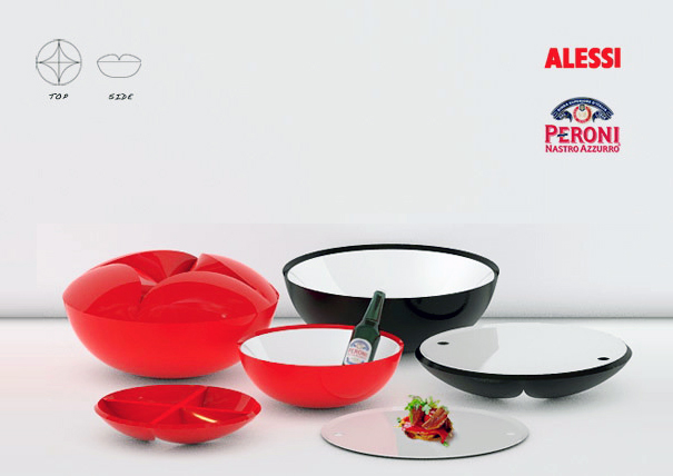 Each of these bowls was made with an anodized aluminum inner layer that can be used to cool 6 Peroni lager bottles (small) or 12 Peroni bottles (large.) In fact, it was made with Peroni in mind, as the designer, Chi Dang, finds Peroni just kissably delicious.