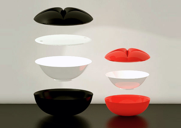 Full lips in mind. The lid opens to reveal a flat serving tray which can be placed on the bowl, lid, or on its own. Also made of thermoplastic and definitely designed with the tongue placed firmly in the cheek.